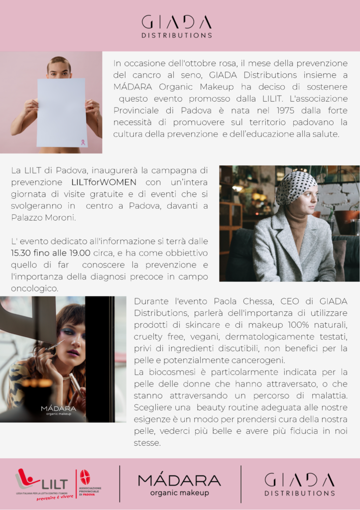 Questo evento dedicato a tutte le donne riporta al centro la consapevolezza che la prevenzione può salvare la vita. A promuovere la giornata dell’8 ottobre al fianco dell’Associazione Lilt ci saranno brand dedicati alla cura della persona come ad esempio Madara Organic Make-up e Giada Distributions