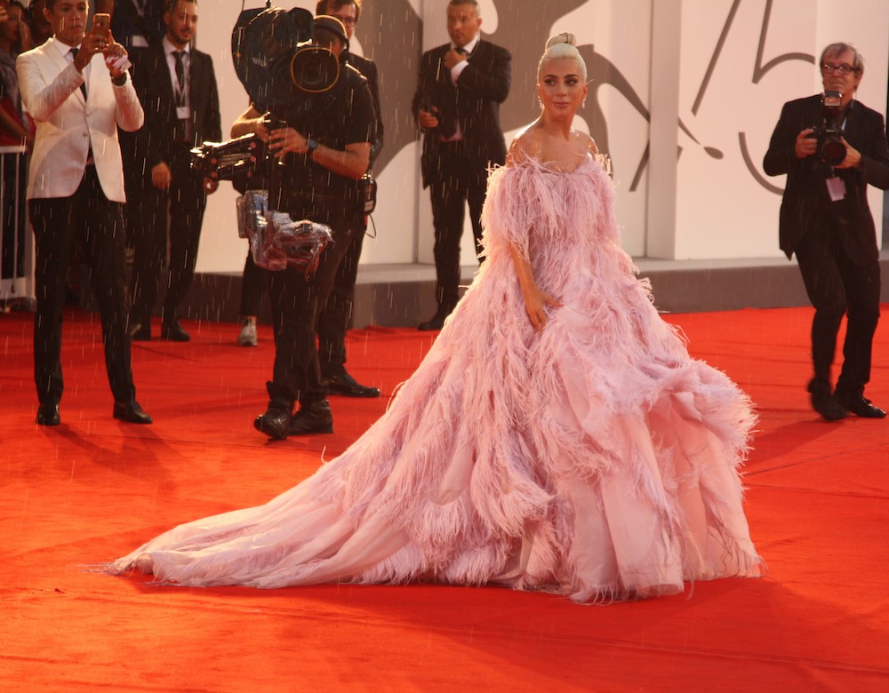 Lady Gaga, Star della musica internazionale, in un abito lungo dal colore romantico, in netta contrapposizione alla grinta dimostrata nei suoi video o durante i suoi concerti.